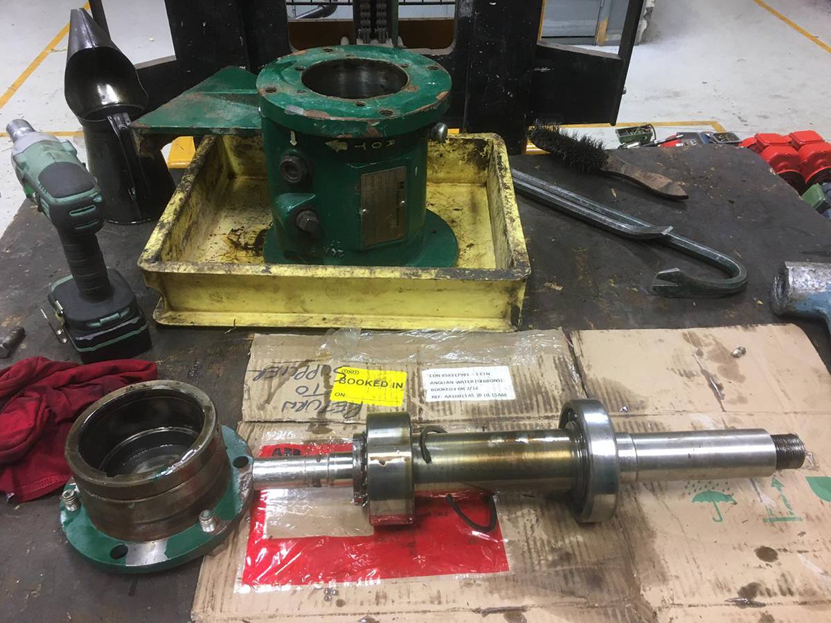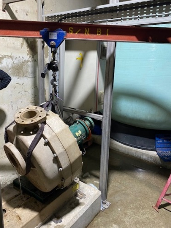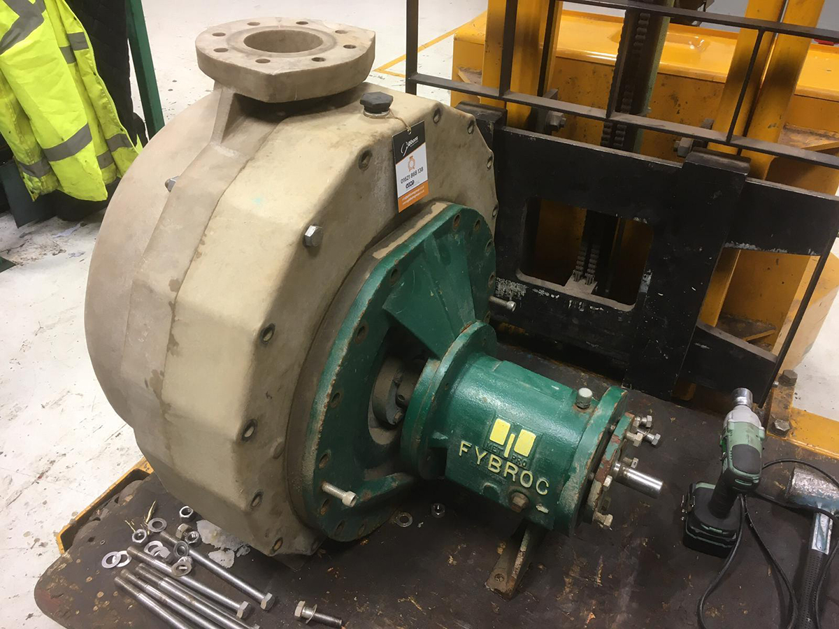 After the pump had been drained the motor had to be unbolted and lifted out of the way using the lifting frame. The coupling was then removed and placed to one side so that the pump could also be lifted by the lifting frame and safely placed onto a pallet along with the motor. Both the pump and motor were then taken back to the Gibbons workshop for inspection.